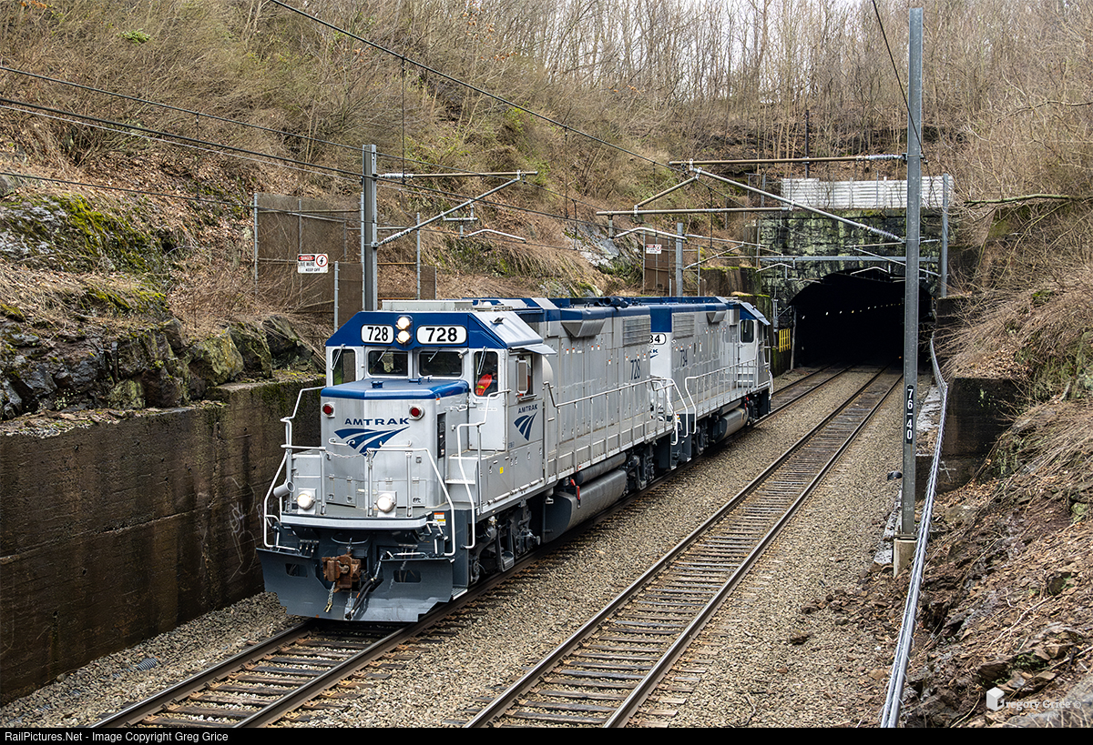 On the rainy afternoon of March 7th, 2024, Amtrak EMD GP38-3's 728 & 734 run lite past the East Haven Tunnels in New Haven, Connecticut on the Shore Line section of Amtrak's Northeast Corridor. 734 (ex LI 263) & 728 (ex LI 253) are two of 36 newly rebuilt EMD GP38-3's purchased from Progress Rail to replace the aging MP15DC work locomotive fleet.