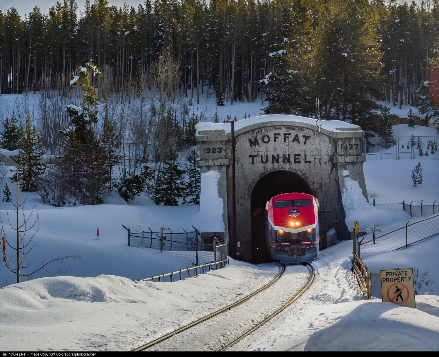 WPE is Early! And early, daylight savings and backing up an hour blessed us with first light over the Great Divide over Winter Park Resort for the arrival of the days Skiers riding on the Winter Park Express with the new image locomotive AMTK 174 leading. Sunday March 10, 2024.