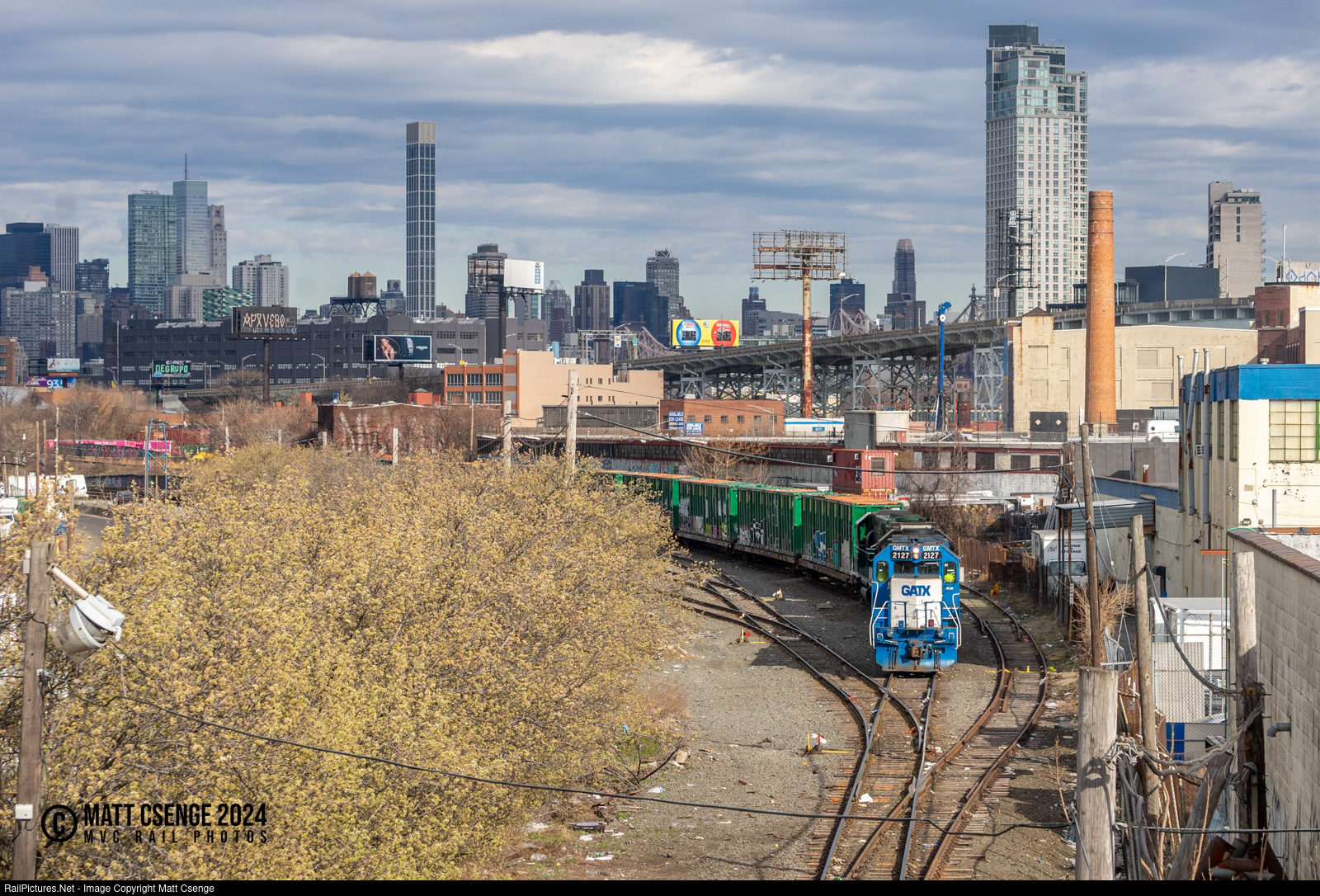 GATX Corporation GP38-2 no. 2127 is seen leading New York & Atlantic Railway train RS40 out of Blissville Yard in Long Island City, Queens. |
