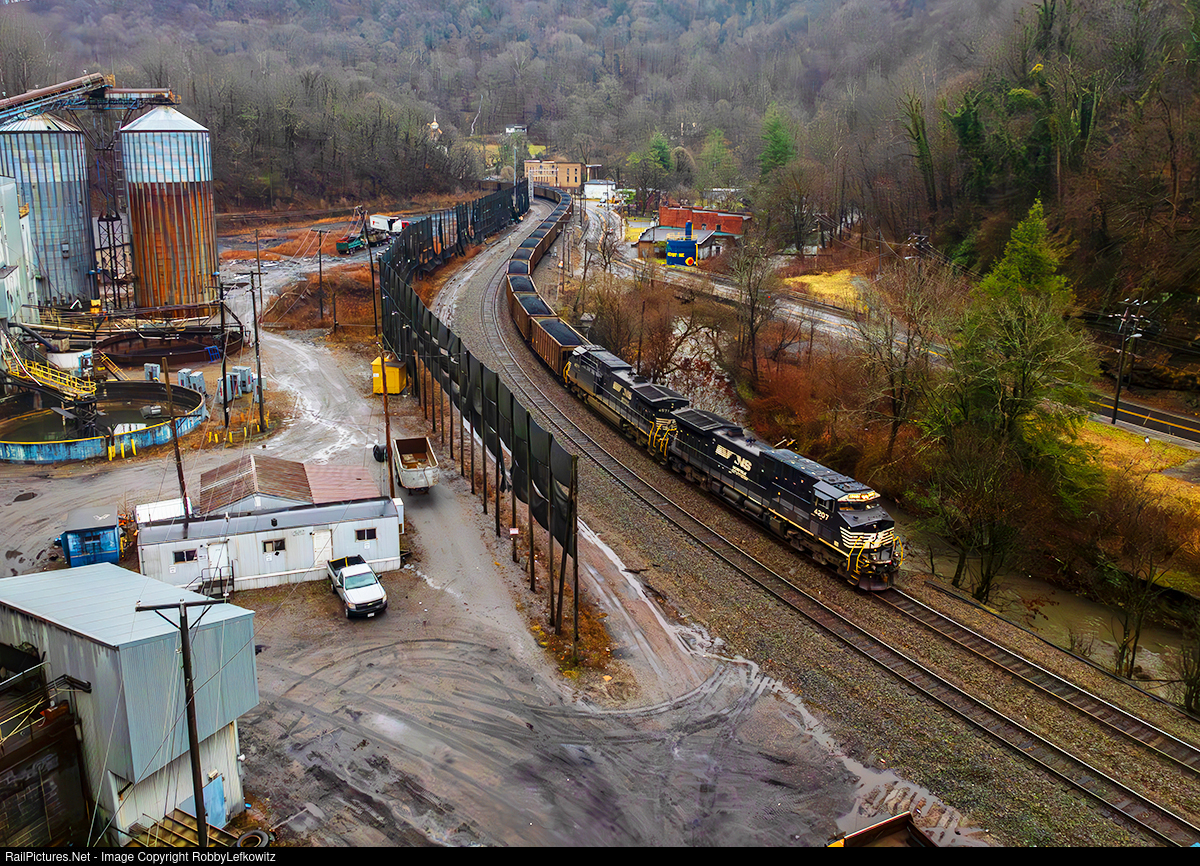 NS 4207 shoves the rear of doubled up loaded coal train NS 758 eastbound through Keystone, West Virginia, along the NS Pokey District. |