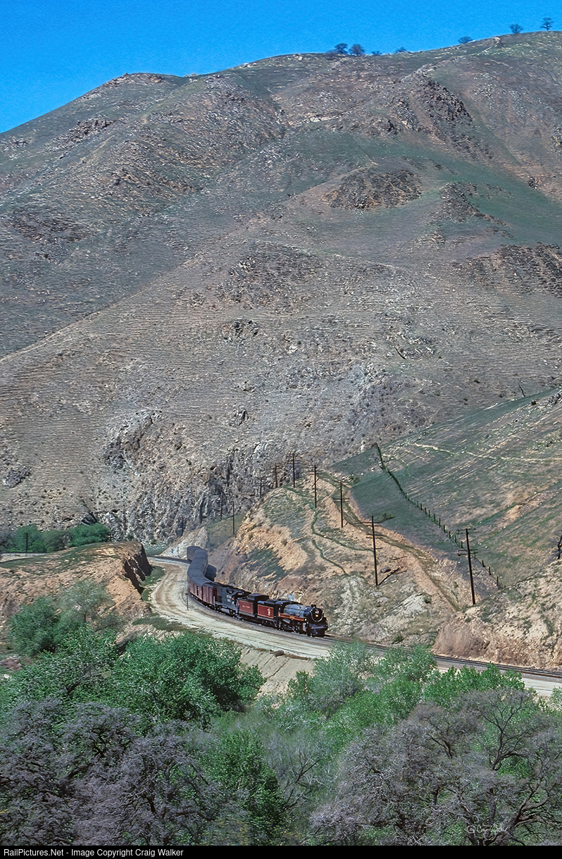 Climbing upgrade toward to cross the Tehachapi Mountains, the grade is about to get a bit steeper in a mile or two. British Columbia "Royal Hudson" 2860 (ex-Canadian Pacific 2860) is on its way to Los Angeles for promotional purposes. The train is not long, but host railroad Southern Pacific required a diesel helper, in this case SP SD45T-2 9307, just in case there is an issue. (Caliente, California – March 29, 1977)