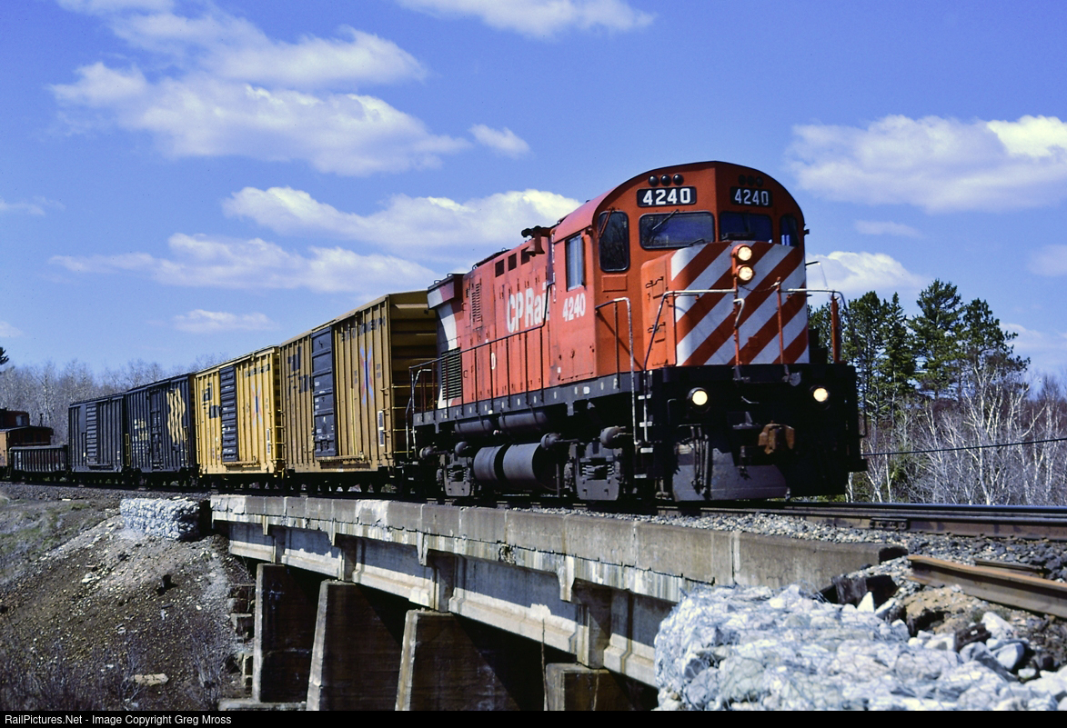 | CP 4240 brings a short freight over Duchesnay Creek near North Bay, Ontario in May of 1988. Couldn't ask for a nicer day! |