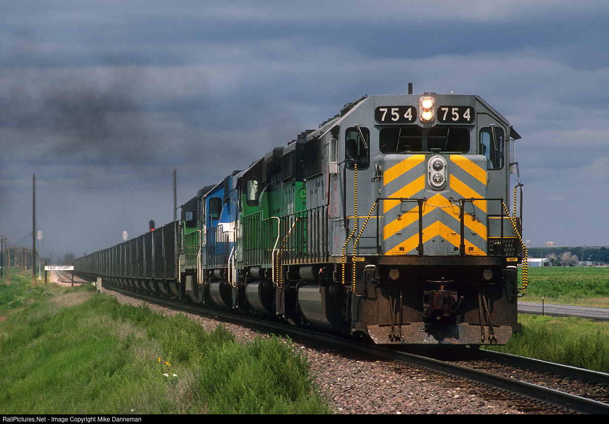 Kansas City Southern EMD SD60 No. 754 leads an eastbound Burlington Northern coal train through East Stuart, Wyoming, on the BN’s Valley Subdivision near the Nebraska state line on July 25, 1992.