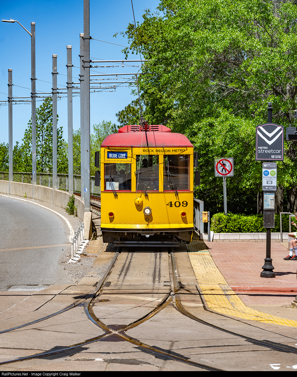 The Metro Streetcar, operated by Rock Region Metro and formerly known as the River Rail Streetcar, is a two-line heritage streetcar system operating in Little Rock and North Little Rock, Arkansas. It has operated since November 1, 2004, and expanded in 2007. The streetcar now operates over 3.4-miles (5.5 km) of track in a figure-eight loop pattern, essentially two loops in each city connected by a single-track stretch across the Arkansas River on the Main Street Bridge. One of the system's five trolleys, similar to old Birney trolleys but built in the 21st Century by Gomaco Trolley Company, rolls to a stop at the corner of Scott and Markham Streets as it ends its trip across the bridge and, after the stop, will head east down Markham toward the Bill Clinton Presidential Library on the Little Rock loop. Car 409 is one of five cars operating on this line; cars 408 and 409 were built in 2004, and cars 410 to 412 were built in 2007.