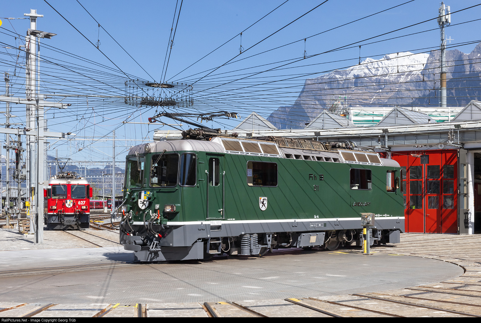 The Ge 4/4 II # 611 "Landquart" of the Rhaetian Railway with 1700 Kw and a maximum speed of 90 km/h was delivered on June 30, 1973 as the first of its series by SLM and BBC, was green with chrome lettering and had round lower lamps on the front. With the delivery of the second series of Ge 4/4 II from 1984/85, the locomotives of the first series also gradually received the new red livery. In 2004, locomotive # 611 was the first of the series to receive rectangular lower headlights with integrated tail lights. From 2007, it was the first of the series to wear an advertising livery for Login, which was changed several times but remained in place until 2024. Now, on the initiative of the "Green and Chrome" foundation, the locomotive was more or less restored to its original condition by the RhB workshop in Landquart and presented in Landquart on april 12th, 2024. The locomotive is still in daily use on the Rhaetian Railway's main network and is also equipped with dual brakes and the new ZSI train protection system. The coat of arms of Landquart with an upright walking ibex (capricorn) with a torch is effectively the coat of arms of the municipality of Igis, which together with Mastrils is now part of the municipality of Landquart.