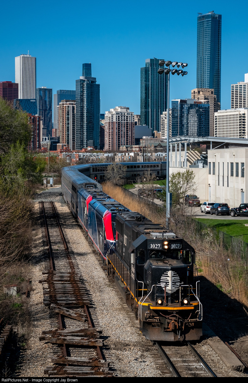 | With an IC SD70 serving as rescue power after both chargers failed mechanically, Amtraks very late City of New Orleans #58 rounds the bend in downtown Chicago. Seen here ducking under the 18th street bridge. |