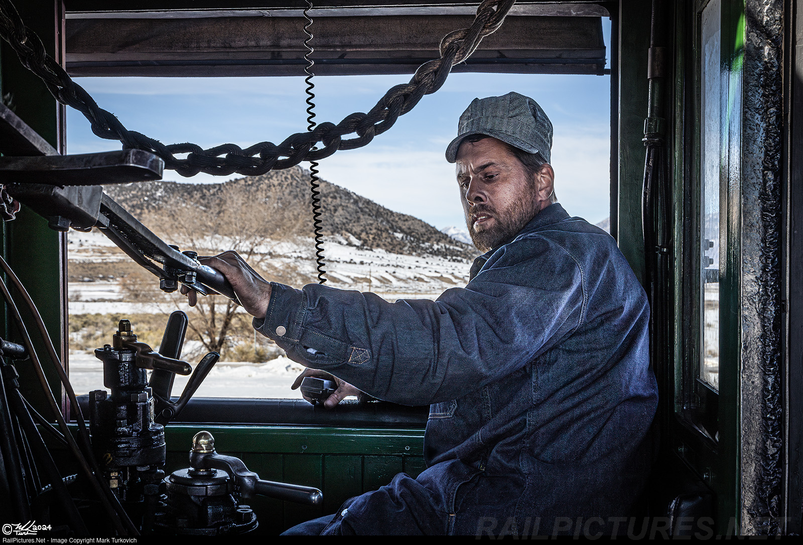 Engineer Bill Megill pulls the throttle on Nevada Northern 81 as it reverses through the East Ely Yard.