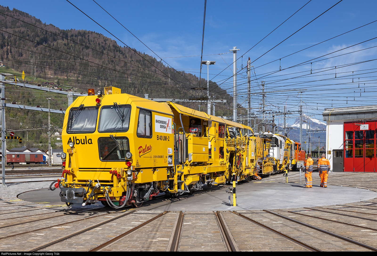 | Meter-gauge track tamping and straightening machine B40 UM-2 "Albula" from SMG (Sersa Maschineller Gleisbau) is turned on the turntable in Landquart. The powerful Rhomberg/Sersa Rail Group vehicle is mainly used on the entire Rhaetian Railway network, but also rarely on other meter-gauge railroads. |