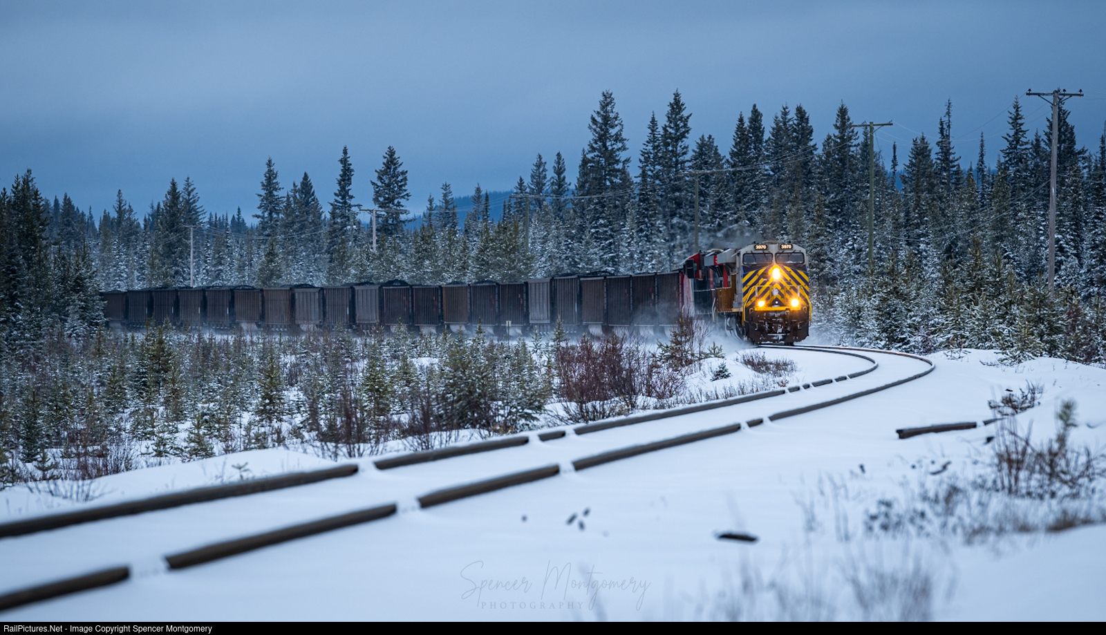 On a cold winter evening, rails still covered in a layer of snow, CN 3970 brings a loaded coal train south on the Chetwynd Sub.