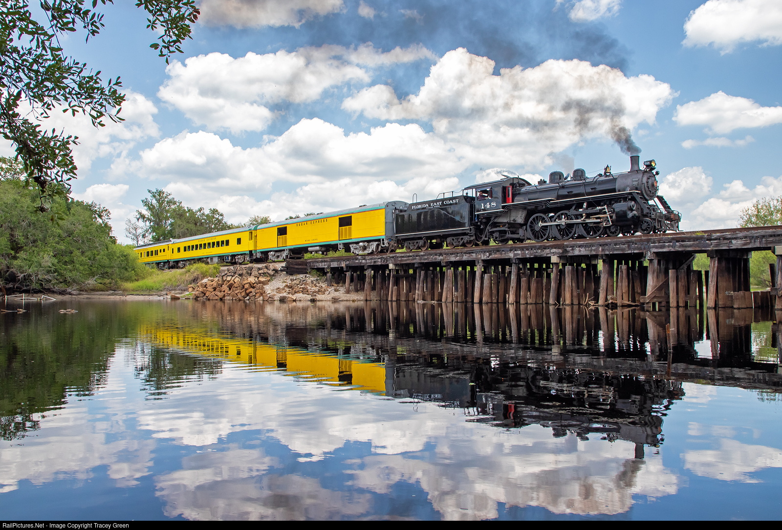 | Reflections of the Way I Used to Be. Dressed up in FEC garb, the beautifully restored U.S. Sugar Light Pacific 148 crosses Fisheating Creek during a US Sugar sponsored photo charter. |