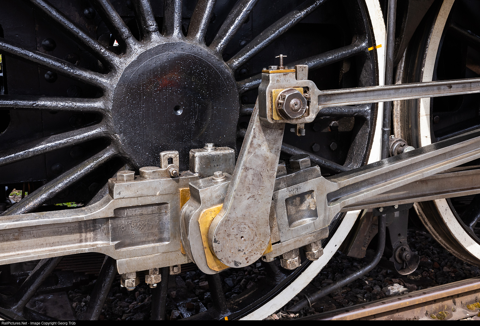 | Drive and coupling rod bearing with eccentric crank on the second drive axle of the 4-8-2 "Mountain" 241 A 65 built in 1931. Quite filigree drive on this four-cylinder compound locomotive with up to 3500 hp output. |