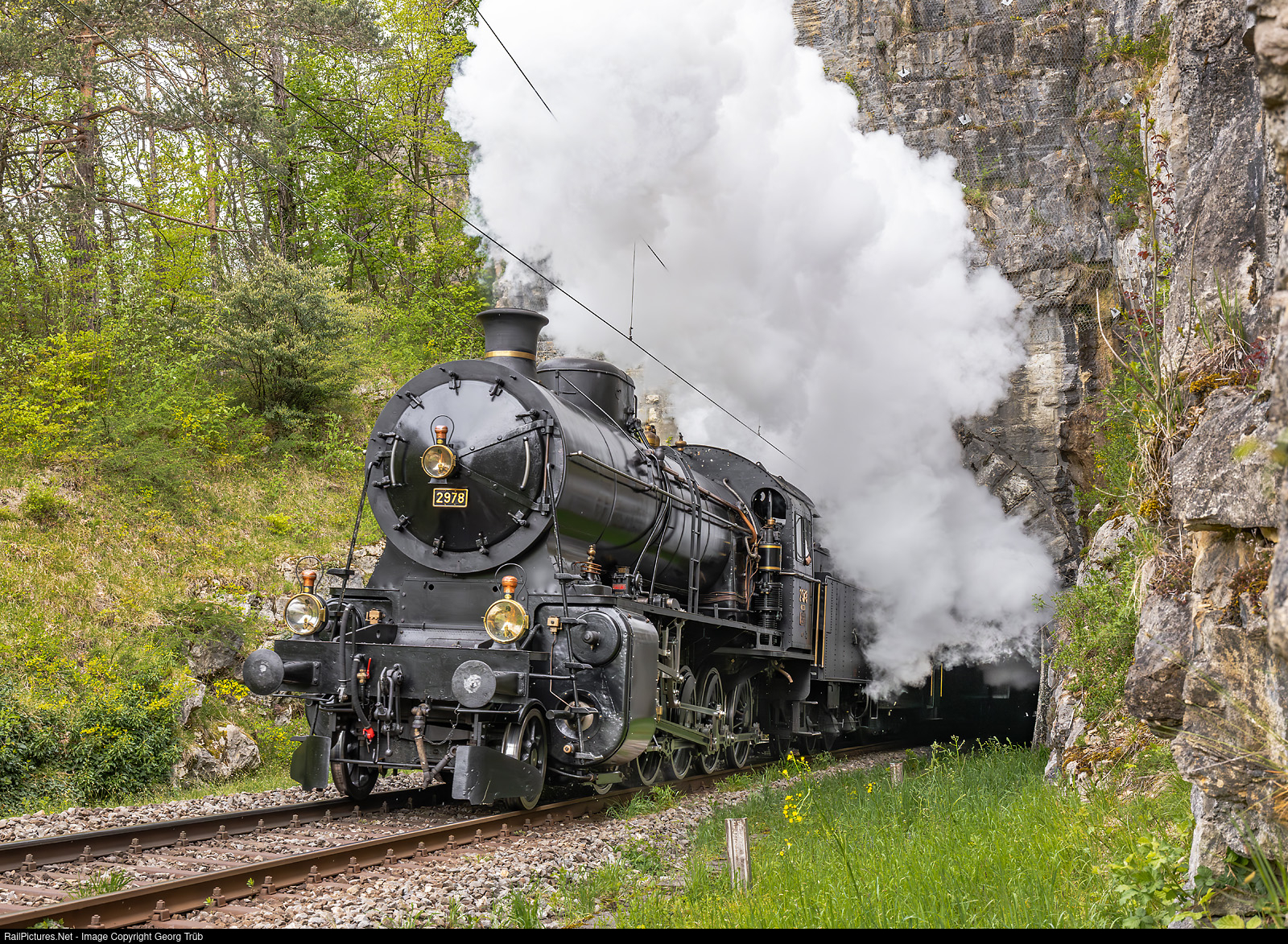 The 2-10-0 four-cylinder compound freight locomotive C 5/6 # 2978 from SBB Historic, built by SLM in 1917, storms at full steam out of the 60 meter long Mühlefluhtunnel on the Hauenstein north ramp with a gradient of 2.3 %. It is pulling the "Dampf am Hauenstein" train 31711 from Sissach via Läufelfingen to Olten, with the 3 light steel coaches A # 2251, B # 5560 and AB 3721 from the 1950s. The Hauenstein line was opened by the Swiss Central Railway (Schweizerische Centralbahn SCB) in 1858 and was double-tracked at the time, today it has been reduced to one track.