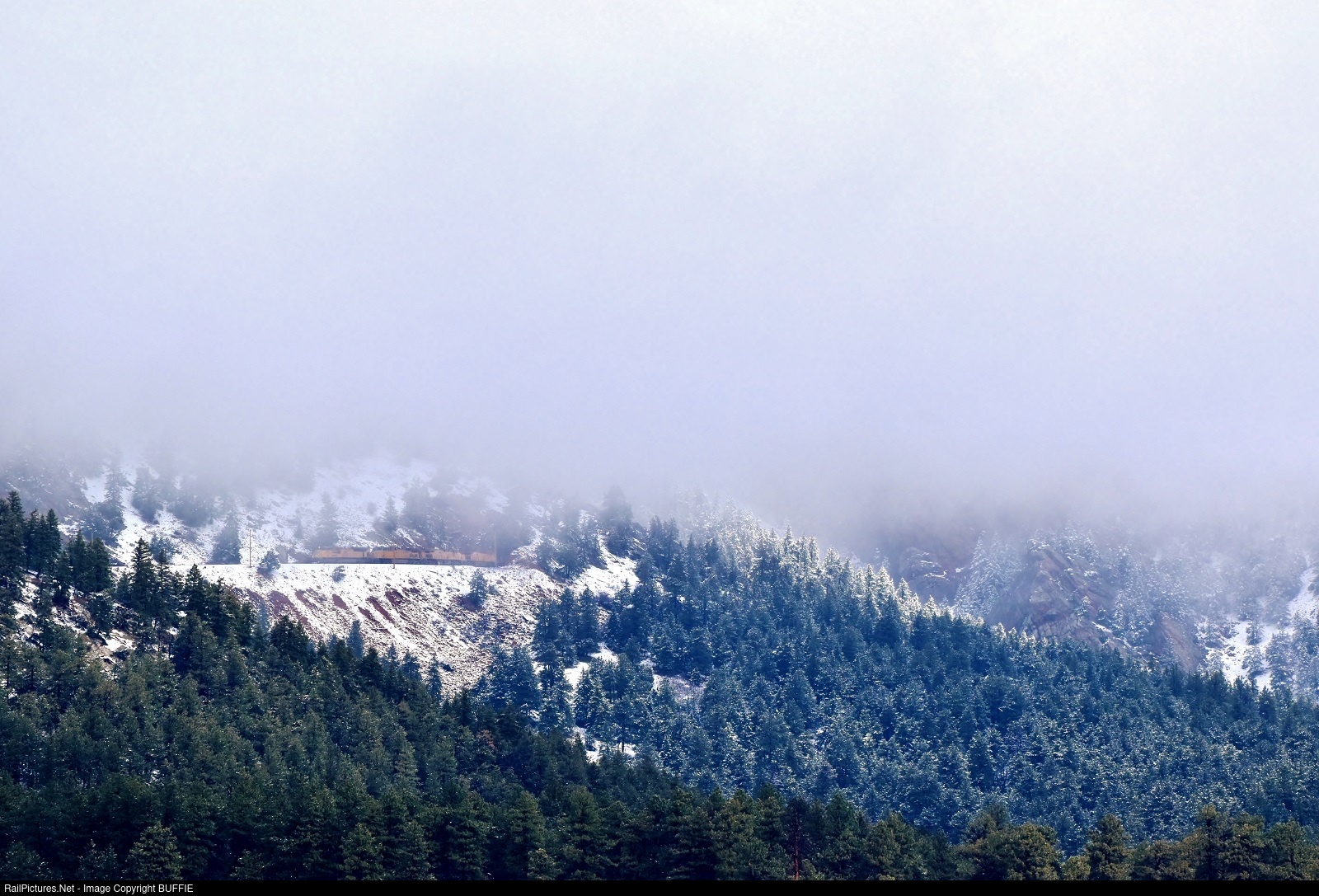 Freezing fog and light snow shrouds Tunnel #4 at Plainview, Colorado as UP 8530 (SD70ACe) leads the Grand Junction to Denver freight down the Moffat Tunnel Sub.