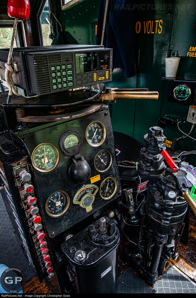 Inside the recently restored cab of Alco 5, the control stand shines in the afternoon sun showing the unique contrast of 1940's engineering to modern day.