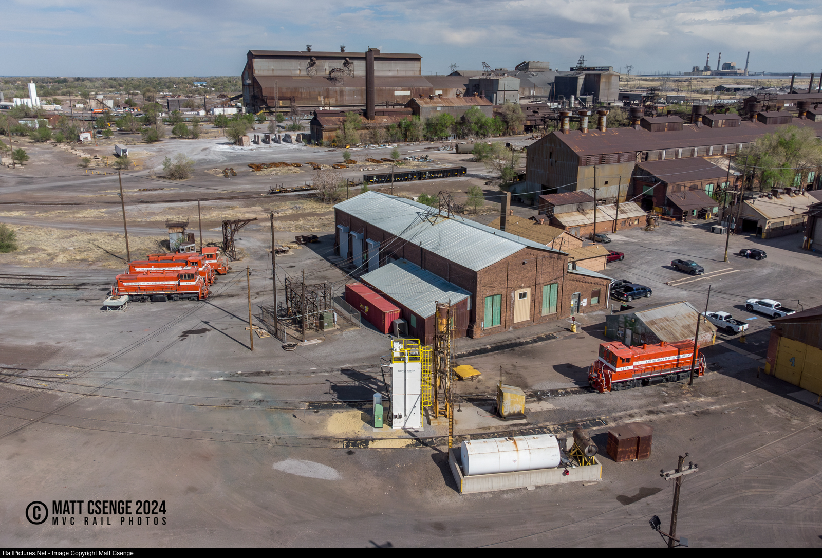 Four Colorado and Wyoming Railway locomotives are seen resting at the railroad's shop building within the Evraz North America steel mill in Pueblo, Colorado - SW8 no. 205 and SW1500 no.s 1201, 1207, and 1208. The railway is a wholly-owned subsidiary of the steel manufacturer, and operates entirely within the steel mill and connects to both Union Pacific and BNSF Railway.