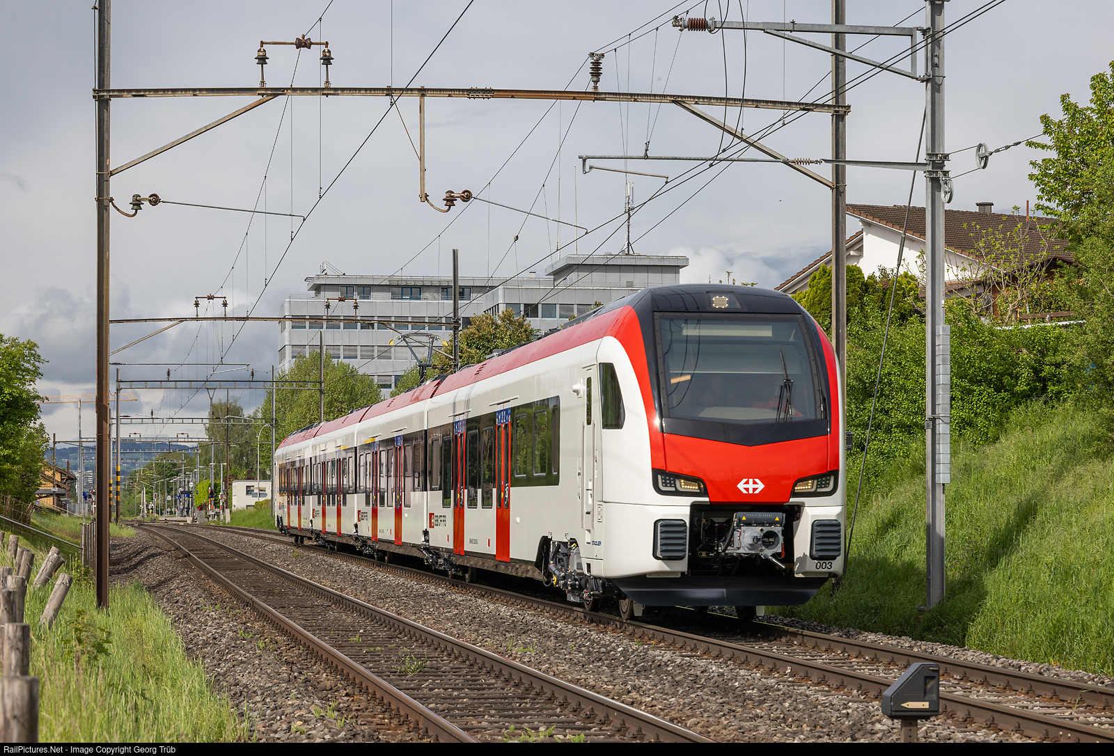 Brand new "Flirt Evo" (Evo=Evolution) RABe 531 # 003 of StadlerRail for the SBB, on the test run 97339 from Sulgen to Romanshorn Seemoosriet, running through Erlen. The SBB, together with daughters Thurbo and RegionAlps, ordered 286 of this new trains in different configuartions.