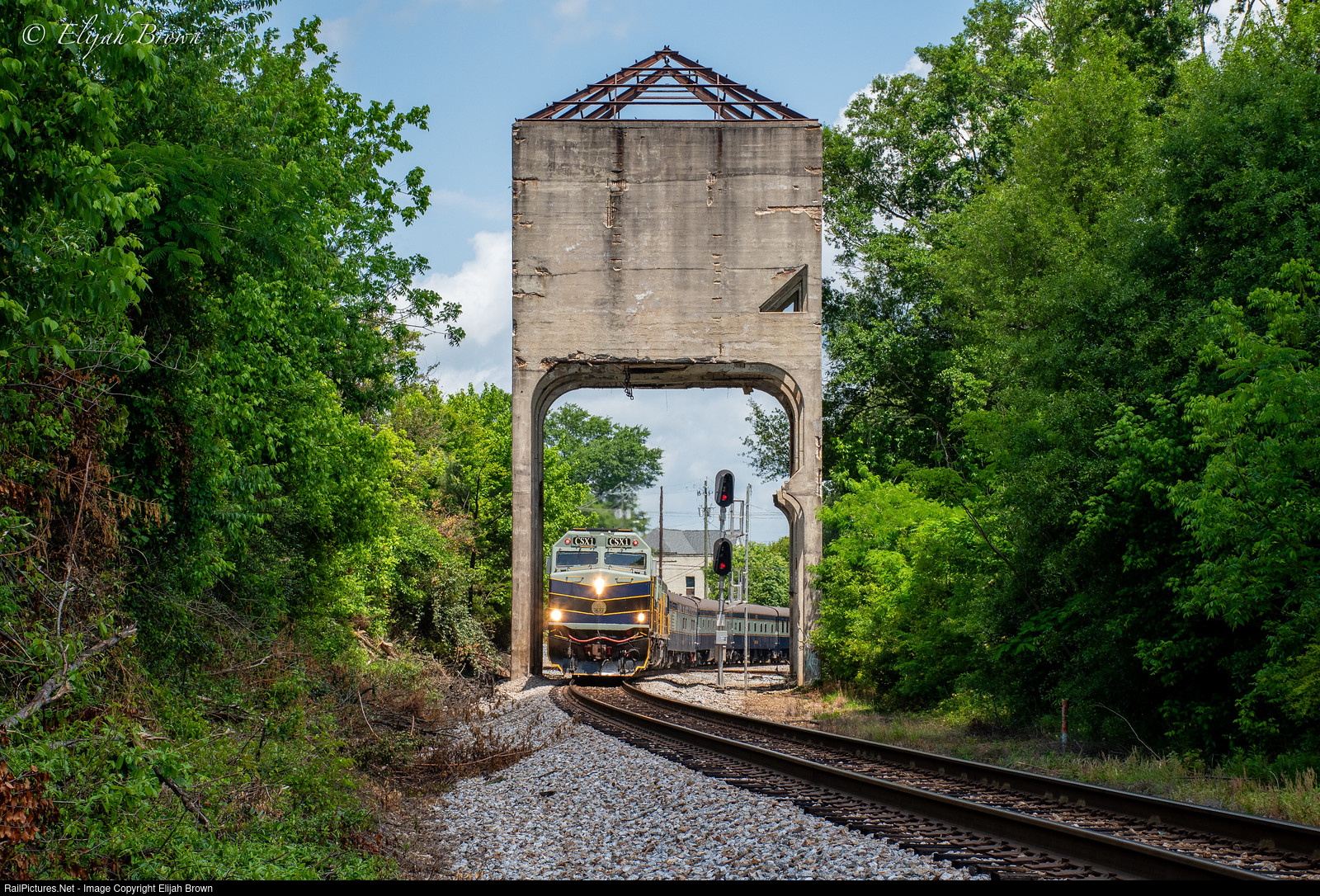 CSXT 1 leads the CSX OCS through Newnan, GA under the old coal tower.