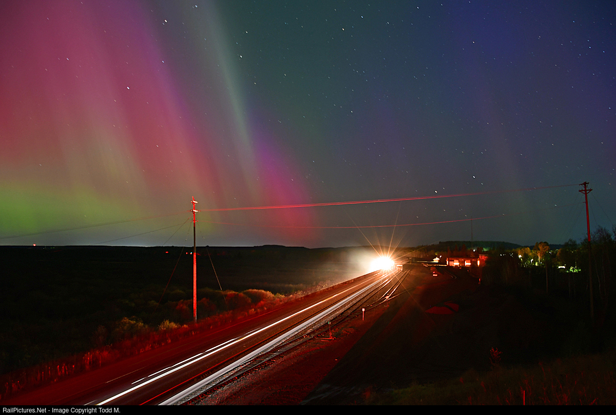| Kicking off National Train Day 2024 at 0100, southbound iron ore loads wait for a northbound empty as they cross paths at Biwabik under some impressive aurora borealis taking place in the sky above. |