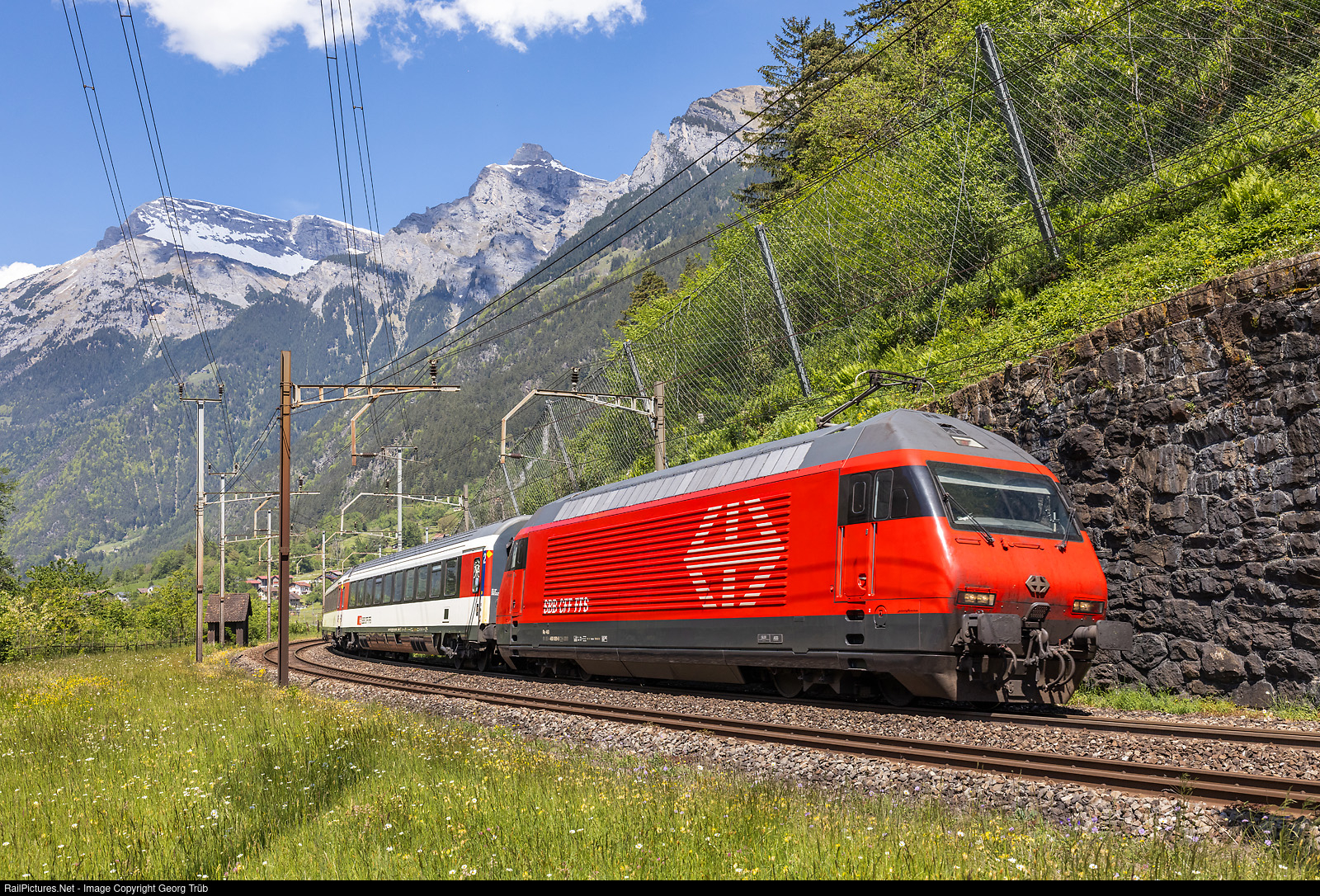 | Reinforced push-pull train with standard cars of type IV and Apm/Bpm cars, and Re 460 # 089 in front and Re 460 # 080 shoving in the rear, rounding the curve at Zwing Uri fortress ruins between Amsteg-Silenen and Gurtnellen, on the Gotthard north ramp. This is train IC 873 of the line IC1 from Zürich via Zug-Arth Goldau-Belllinzona to Lugano. |
