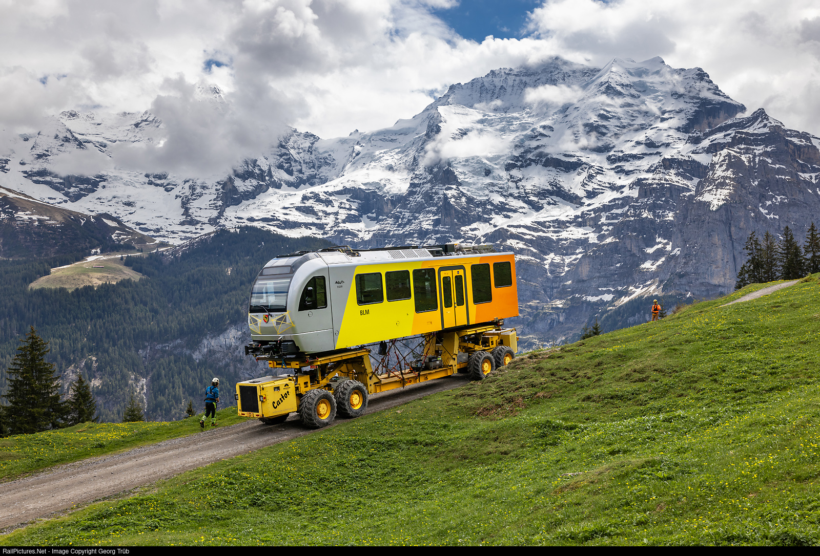 The Lauterbrunnen-Mürren mountain railroad (BLM), which belongs to the Jungfraubahn Holding, consists of an aerial cableway from Lauterbrunnen to Grütschalp and a meter-gauge adhesion railroad a good 4 kilometers long from Grütschalp via the Winteregg crossing station to Mürren. StadlerRail is supplying three new Be 4/6 # 101 to # 103 double railcars for the Grütschalp-Mürren line. The first vehicle # 102 was delivered in October 2023 already for tests. On 13 and 14 May 2024, the two car bodies of train # 101 "Eiger" were transported by special transport from Lauterbrunnen (797 meter a.s.l.) via mountain roads to Winteregg (1578 meter a.s.l.), where they were mounted on the bogies. The special vehicle "Castor + Pollux", which belongs to the company Mountaintrans AG, was used for the transport. Von Rotz & Wiedemar Seilbahnen in Kriens, in collaboration with Wipfli Transporte AG, is responsible for the know-how, operation and maintenance. The journey on the 7,5 kilomter long, partly not paved road to the Winteregg needed about 4 hours. The transport is now below Winteregg, with Eiger, Möch and Jungfrau in clouds in the background. The Castor+Pollux special transport vehicle travels at approximately walking speed and is radio-controlled by operators on foot.
