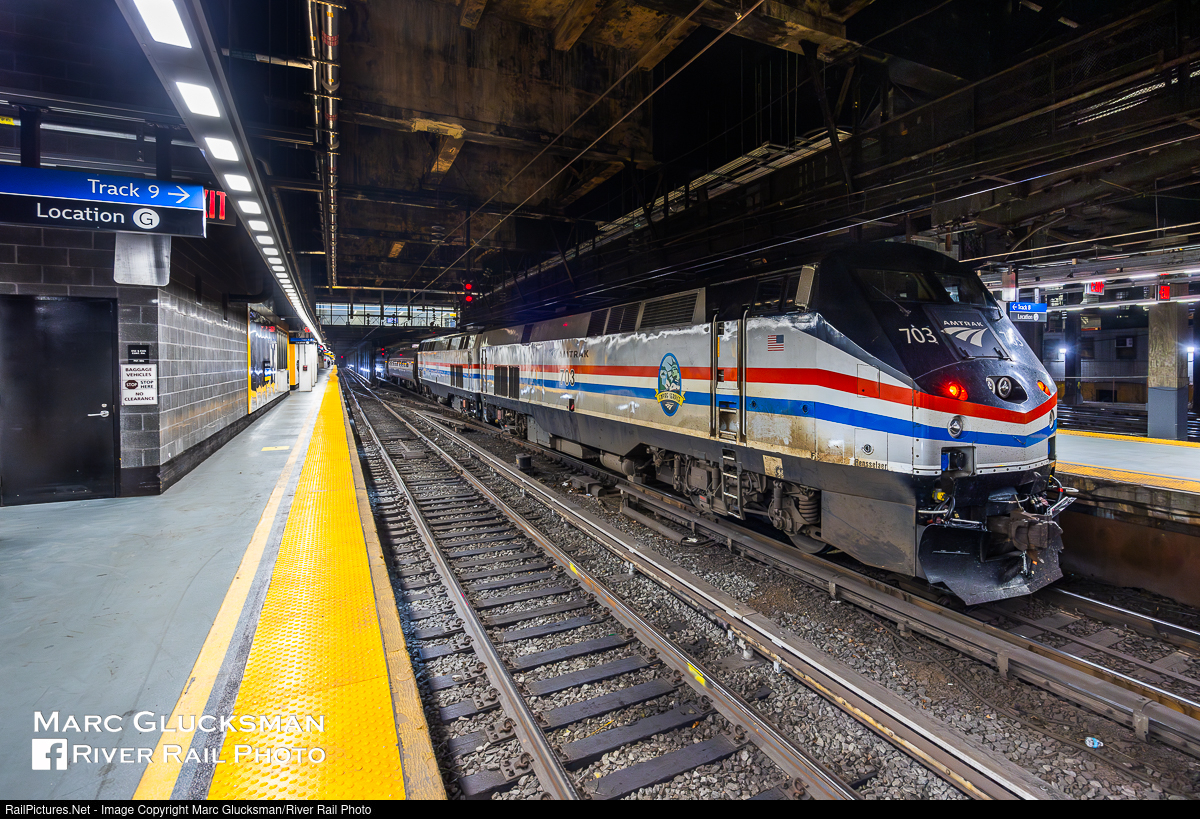 Back To Back Phase III DMs. On Sunday, May 12, 2024, Amtrak Train 261 was led by P32AC-DMs AMTK 703 and 708 back to back, seen getting ready to depart Moynihan Train Hall/New York Penn Station in New York, New York for Albany-Rensselaer, New York. The standard Empire Service consist uses only one locomotive, in this case the second locomotive was assigned to the train for post repair road testing. Seeing it in this position is very unusual, and evokes the appearance of a classic long distance train.