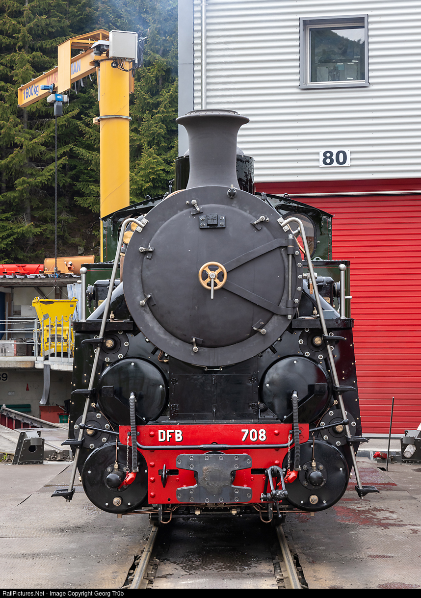 On May 23, 2024, the steam cogwheel locomotive HG 4/4 # 708, built in 1930 by SLM in Winterthur for the former railroad company Compagnie Génerale de Colonies Paris in Indochina, now Vietnam, was fired up for the first time in several decades. The following day, it pulled out of the depot in Realp and onto the turntable. The locomotive was brought back from Vietnam in 1990 as part of the "Back to Switzerland" campaign, more or less as scrap. Like its sister locomotive # 704, it was completely refurbished over many years by the staff at the workshop in Uzwil and is as good as new. On this day, the plan was to heat the fourcylinder compound locomotive up to 14 bar boiler pressure and repair any leaks so that it could be presented to the boiler inspector in the next few days. The inscriptions "DFB 708" on the buffer beam in shadow lettering were painted on by hand by Michaela Hardmeier. This type of HG 4/4 locomotive had never run in Switzerland before and was delivered directly to Indochina by SLM.