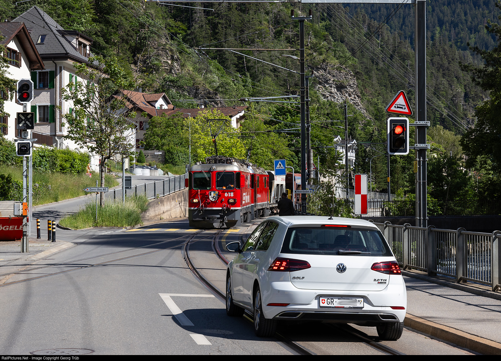 Last October, the Rhaetian Railway parked the 6 ABe 4/4 # 51 to # 56 railcars on the Bernina line. As a result, during the summer half-year, when the various Bernina Express trains are running, there is now an average shortage of around 2 “Allegra” dual-current railcars (ZTZ) to cover all services, especially on the Bernina and to Arosa. For this reason, push-pull trains with Ge 4/4 IIs are now used between Chur and Arosa, and freight trains are also operated with two Ge 4/4 IIs. Freight train 5446 from Arosa to Chur is street running on the Sand street along the Plessur river at Chur Sand with Ge 4/4 II # 618 and # 617 in multiple control and two empty Fac gravel cars. The two entry switches in Chur Sand can be cut open and are automatically returned to the right-hand position. The train will therefore travel on the track leading to the left, while trains traveling in the opposite direction will travel on the other track (where the car is now) and “cut open” the switches.