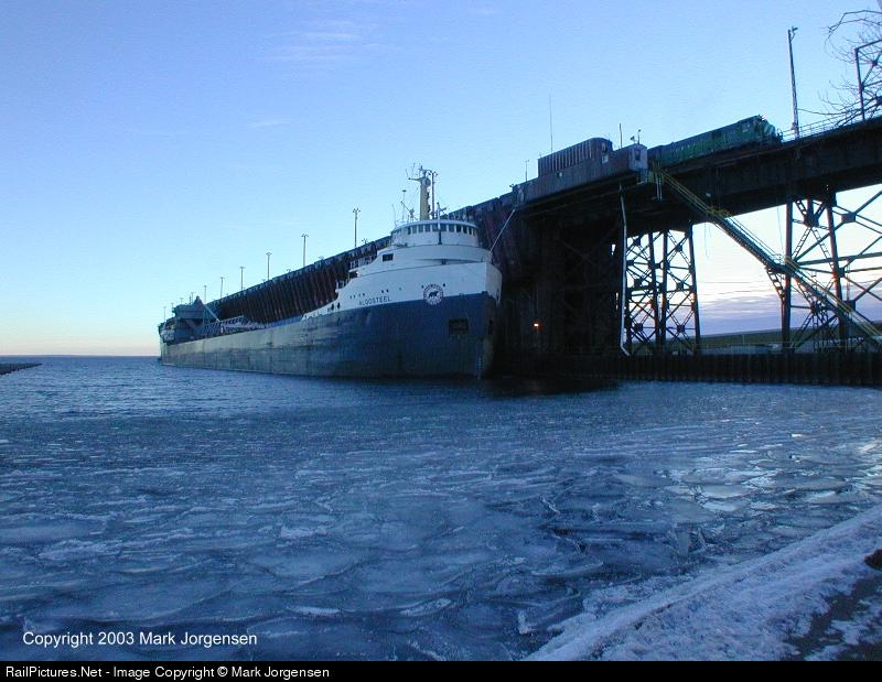 | LS&I U-30C pushes ore hoppers (Jennies) onto the ore dock. The Algosteel is in port, taking on a load of taconite(Iron ore). The ice is starting to form on Lake Superior as the 2002 shipping season draws to a close. |