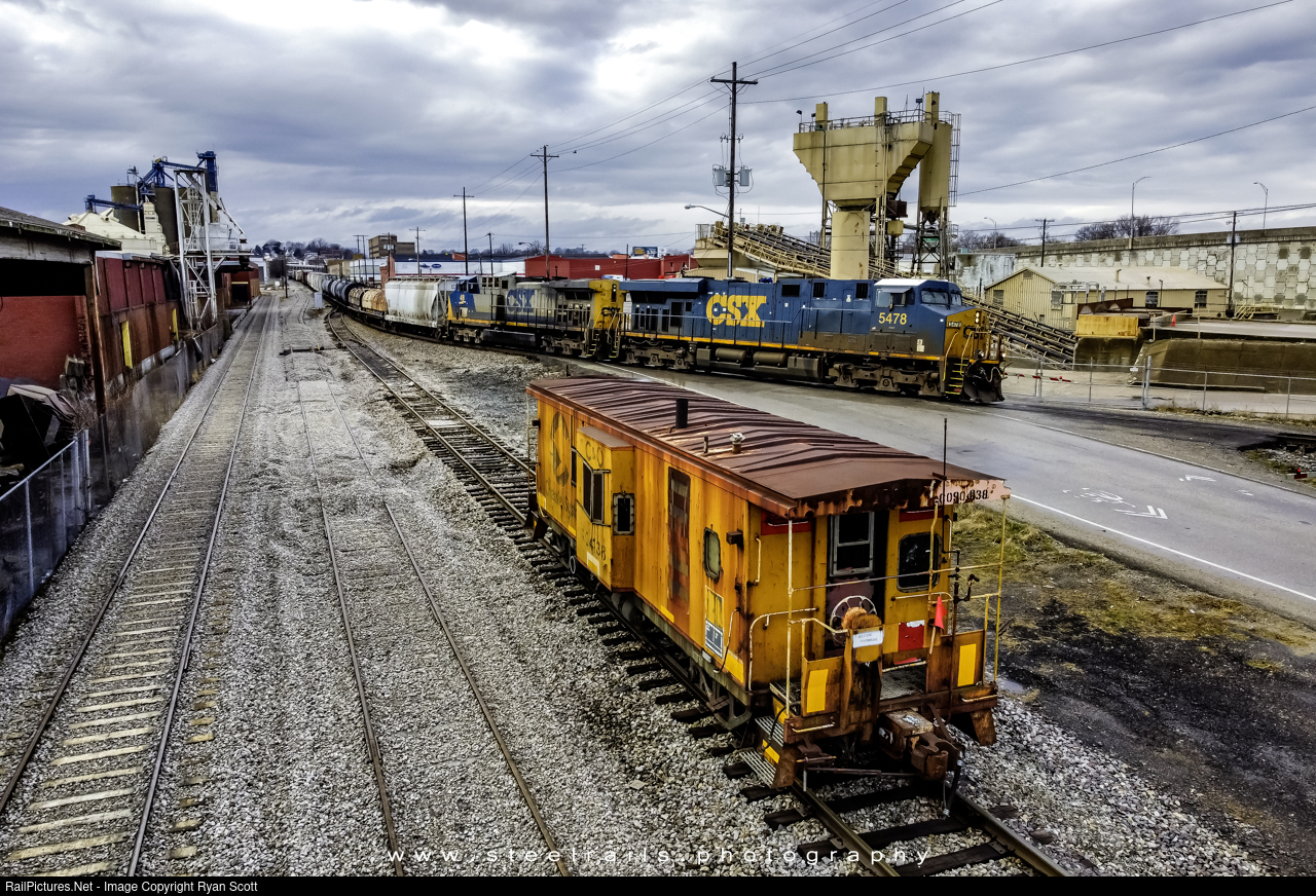 | CSX Transportation CSXT 5478 GE ES40DC leading Q512 a mix freight past this old Chessie System Steel Bay Window Caboose that CSX use for a shoving platform thought town in Evansville, Indiana on January 1, 2021 |