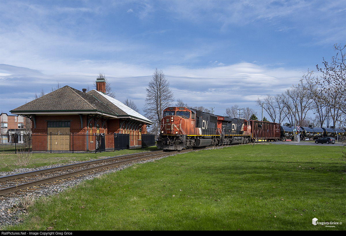 On April, 23rd, 2024, Canadian National Train 323, with EMD SD75I (GF-643a) #5659 leading, passes the former Grand Trunk Railway Saint-Jean-d'Iberville station as it curves west on the CN Rouses Point Subdivision in Saint-Jean-sur-Richelieu, QC, Canada.