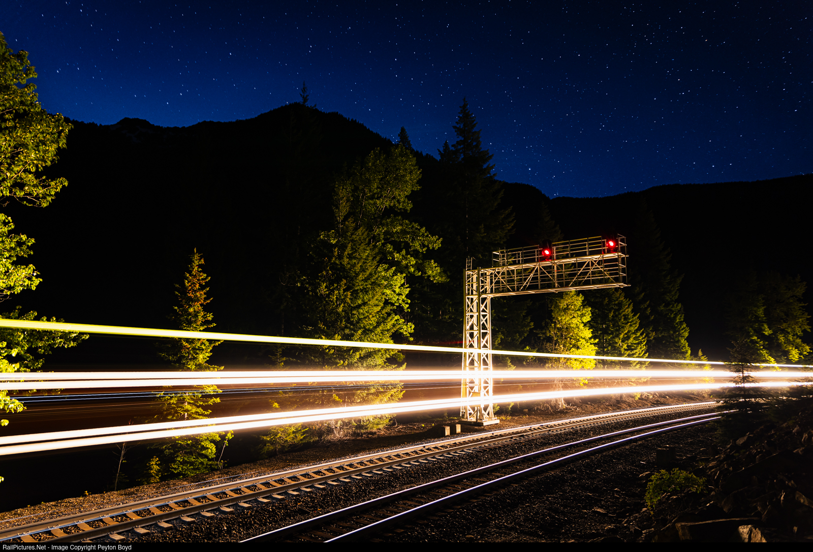 | Night falls while I patiently wait at the Eastbound control signal at Berne. As the sky begins to clear and the stars start to pop out I finally see the signals light up and begin to hear the sounds of a single ES44 climbing the 2.2% grade. BNSF J-NEWINB enteres East Berne on a proceed prepared to stop indication because the Cascade Tunnel is not yet done with its “flush”. I was close to giving up after waiting for hours and getting sketched out being in the woods so far from my car alone. But it was worth the wait and my headlamp was clutch I would strongly recommend for night photography. |