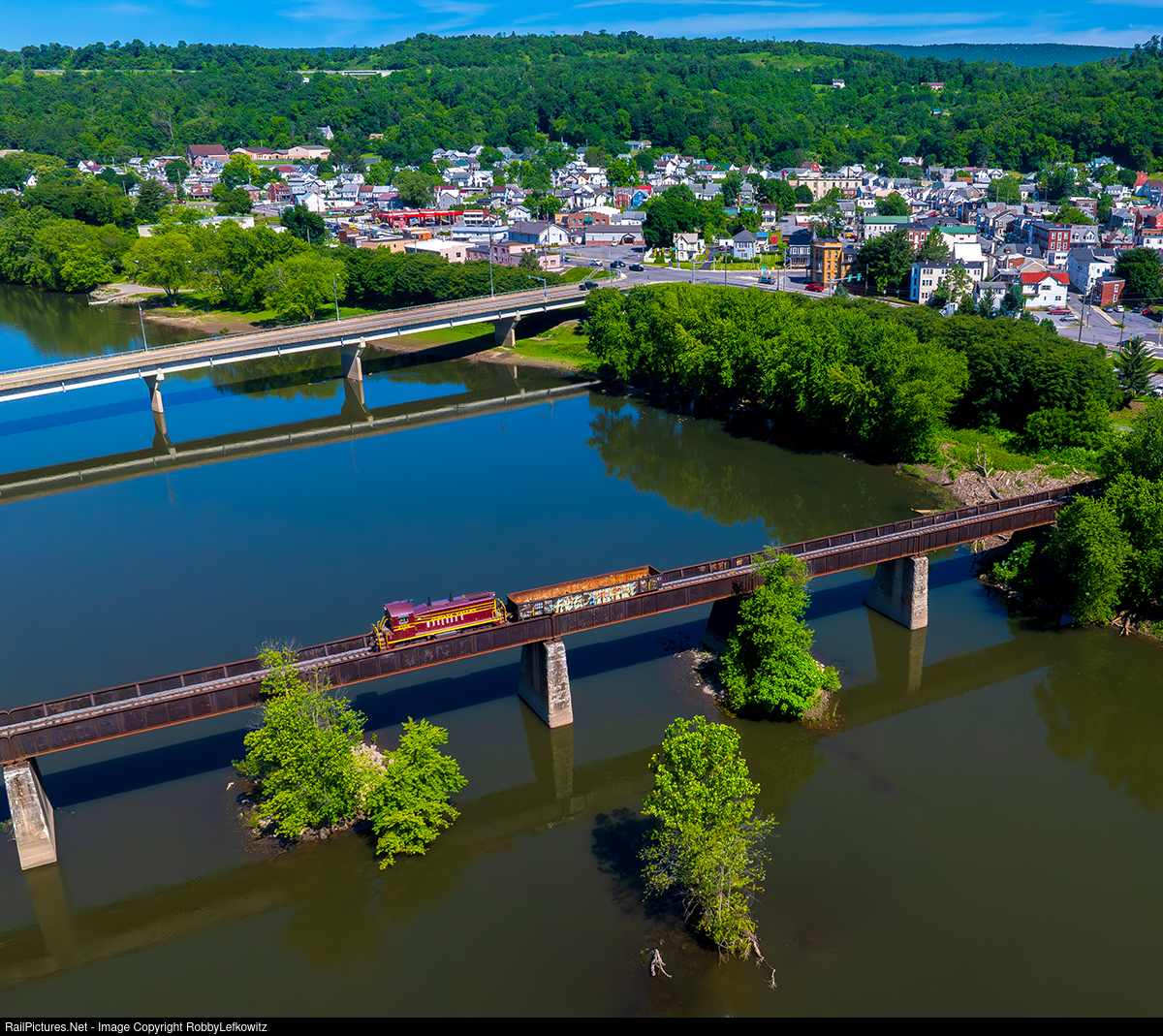 JVRR 2106, part of the North Shore Railroad, leads JVR 1 back into the yard in Lewistown, Pennsylvania, after having just completed their morning work at Standard Steel.