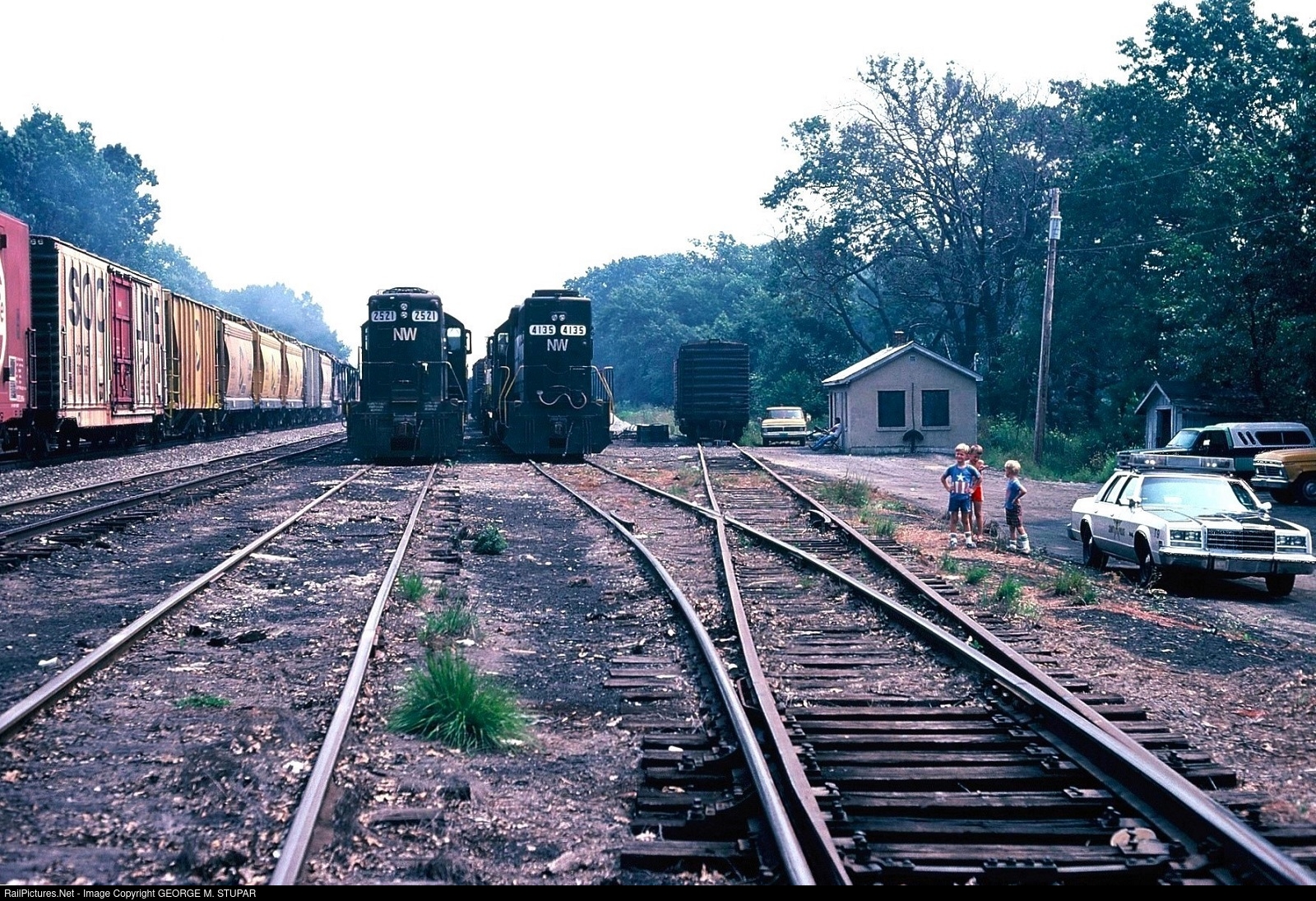 A fast manifest hustles east on the former Nickel Plate Road Chicago-Fort Wayne mainline, while the daily local freight waits in the yard alongside a Speno train, on a very hot, hazy, and humid August day in 1981. It was always a good time and fun when my railfan sons tagged along with me on trackside adventures. Miss those days.