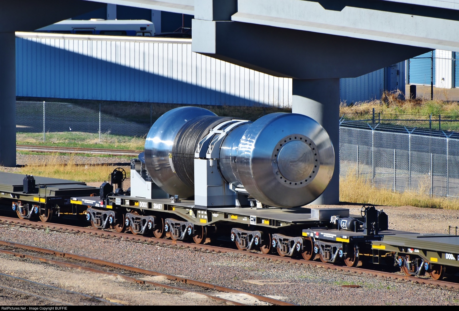 | Here is a good look at DODX 39497, the Department of Defense's nuke cask heavyweight flatcar designed to carry spent nuclear fuel rods. It stopped by the yard in Denver for a few days.