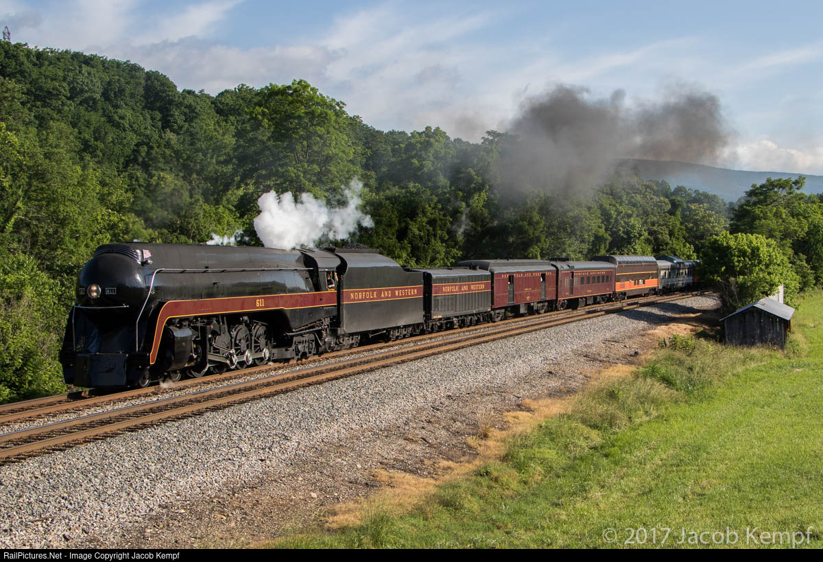 | Norfolk & Western 611 storms westbound up the grade of the Norfolk Southern Christiansburg District with an excursion bound for Radford, VA. I was the very first person to arrive at this location. By the time the J arrived, close to 50 people had joined me in a photo line along Gumwood Lane. |