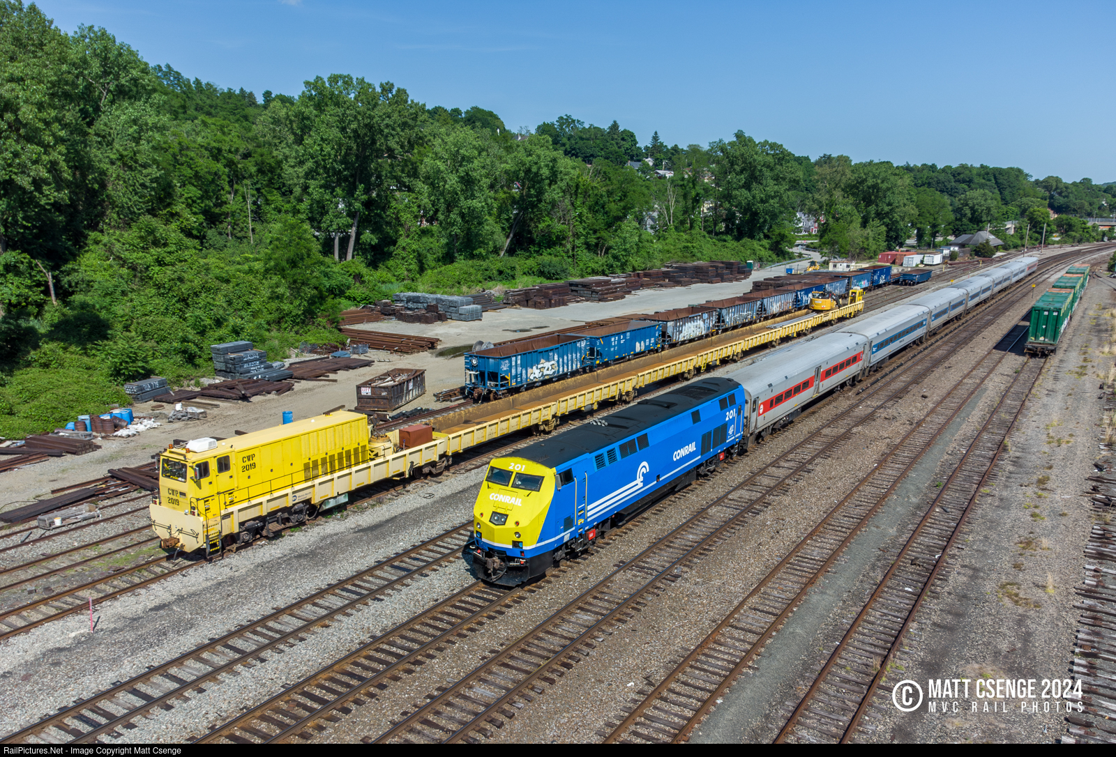 It Was All Yellow. Sporting a bright - very bright - yellow nose in its Conrail heritage scheme, Metro-North Railroad P32AC-DM no. 201 is seen shoving Hudson Line train 8844 past Continuous Work Platform (CWP, aka "Slot Train") no. 2019, which is laid up on a siding near Croton North Station.