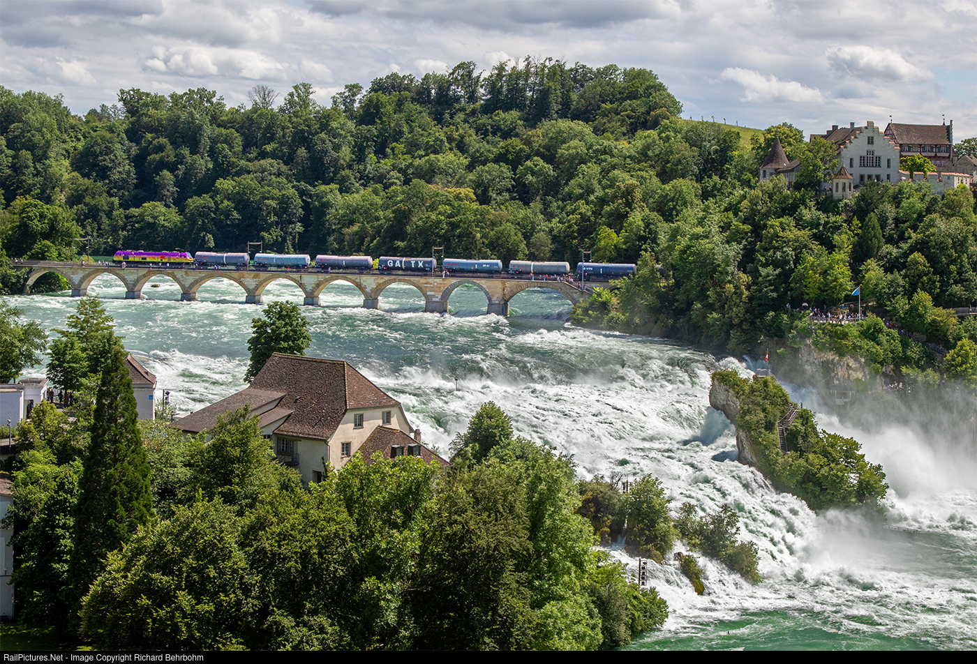 | The sixaxle 9000 kW multisystem "EURO9000" has an electric and a diesel-electric power unit and was built by Stadler. The locomotive is pulling empty tank cars from Tankanlage Rümlang via Winterthur to Ingolstadt (Germany). The diverted train is crossing the bridge above the Rhine Falls. |