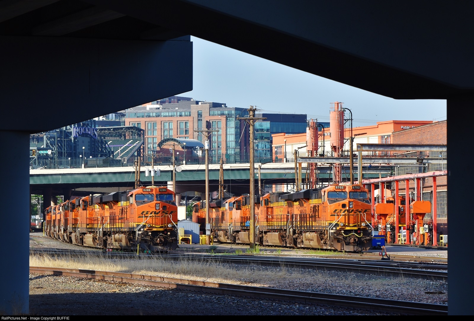 | A group of BSNF heavies sit in the downtown Denver engine servicing yard, waiting for either service or assignments. |