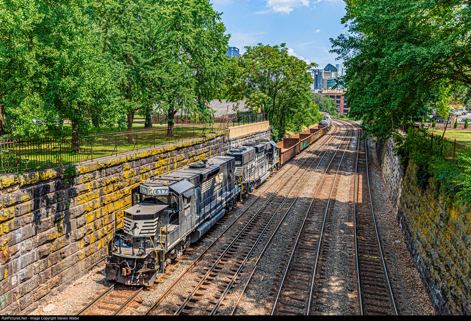 NS 617 on 6/17, what are the odds? NS Local C28 travels west through "The Trench" after picking up a line of cars east of CP Penn. NS 6659, one of the Operation Lifesaver engines, follows. The skyscrapers from downtown Pittsburgh peek through the trees.