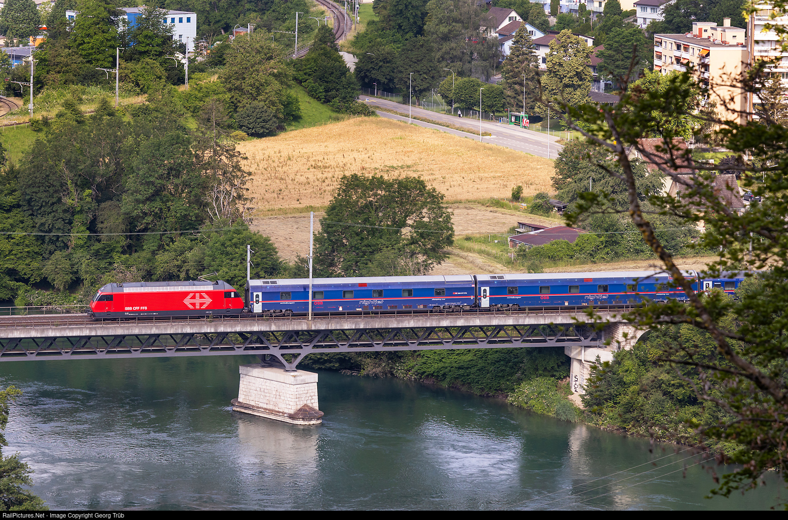 | An unknown Re 460 of the SBB pulls the NightJet 471 from Hamburg Altona to Zürich over the Aare bridge in Olten joint line. |