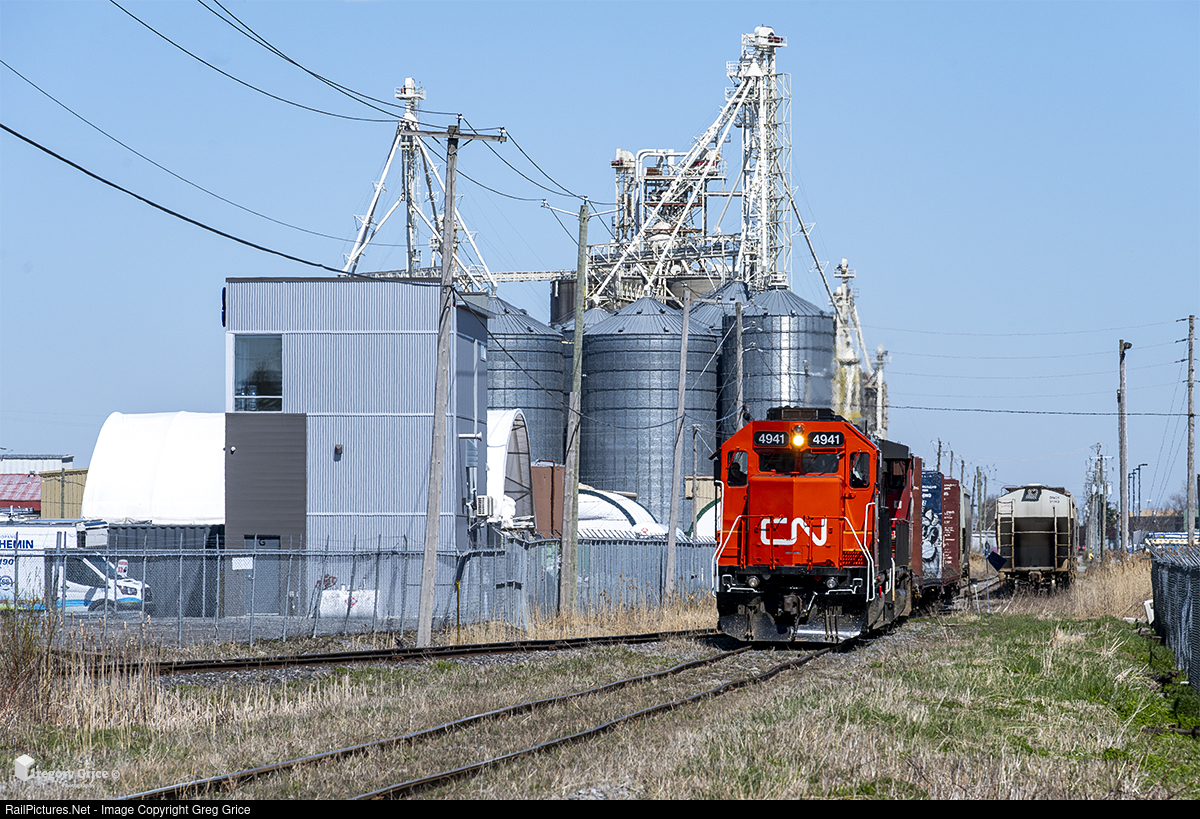 On April, 25rd, 2024, Canadian National Train 522, with EMD GP38-2 #4941 leading, shoves a cut of cars towards Nova Grain on the St Jean wye along the Rouses Point Subdivision in Saint-Jean-sur-Richelieu, QC, Canada.