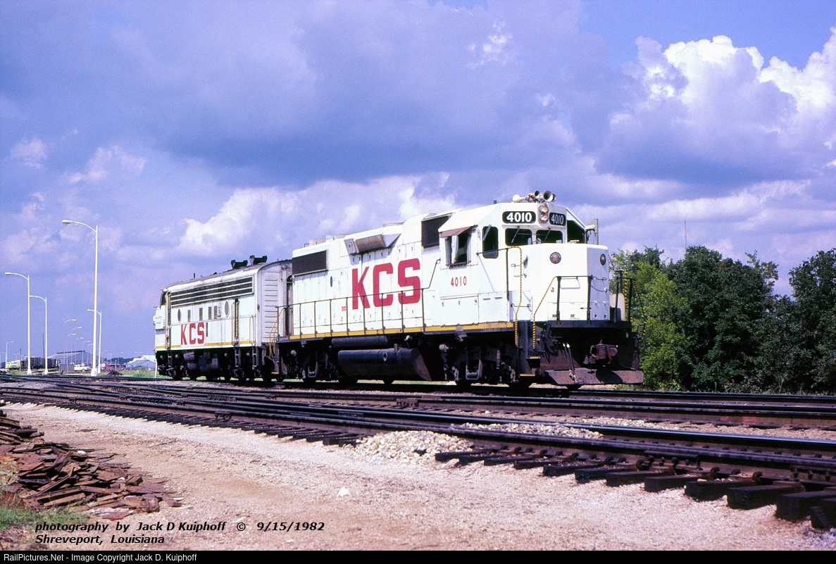 | Kansas City Southern, KCS GP38-2 4010 -F7A 4062 at the south end of Deramus Yard, Shreveport, Louisiana. September 15, 1982. Jack D Kuiphoff © photo |