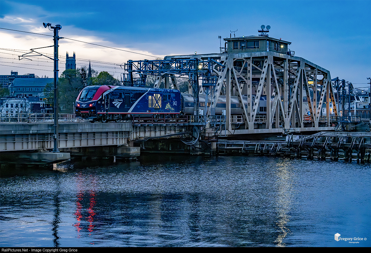 With just a smidge of light left on April 27th, 2024, Amtrak Extra 127 is seen towing Siemens "Charger" ALC-42 #342 east over the Shaws Cove Bridge in New London, Connecticut on the Shore Line section of Amtrak's Northeast Corridor. 342 was on its way to Southampton Street Shops in Boston, Massachusetts for Mechanical Department familiarization training. This would mark the first time a Charger has traveled on the New Haven-Boston (NHB) portion the Northeast Corridor.
