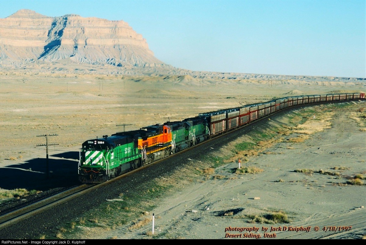 | Burlington Northern, BN C30-7 5064 -BNSF C44-9w 1112 -SD40-2 7027 -8131 with a westbound on the ex-D&RGW at Desert Siding, Utah. April 18, 1997. Jack D Kuiphoff © photo |