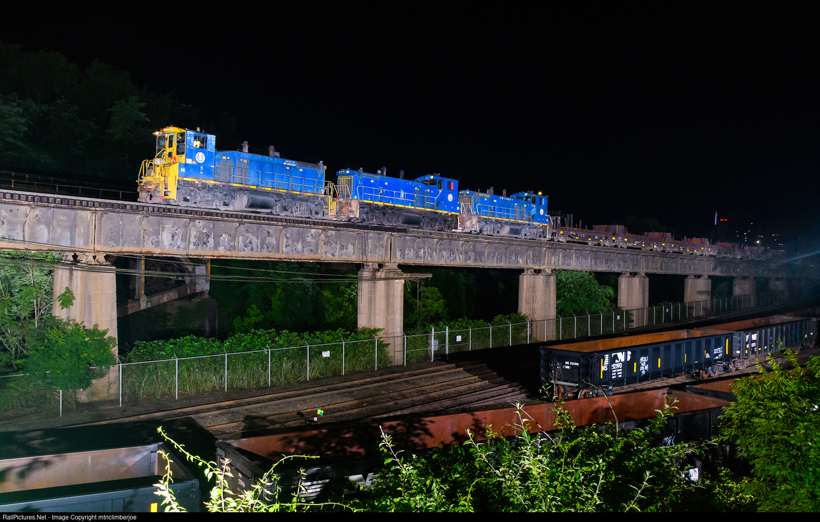 | The Union Railroad's second shift crew working on Job 76B has arrived in East Pittsburgh, Pennsylvania with a train of empty slab cars from the Irvin Works. With the conductor riding in the caboose, the trio of MP15's ease the train down the ramp that descends in to the yard at the US Steel Edgar Thompson Works where the cars will be positioned for loading. |