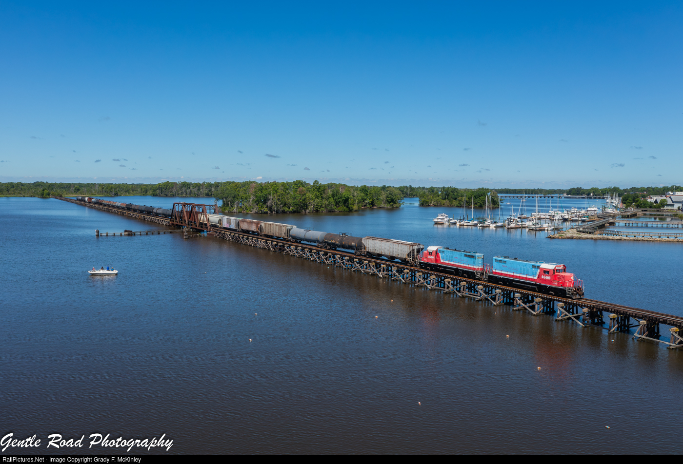 | Carolina Coastal's #119 job returns eastbound across the long Pamlico River drawbridge linking Washington with Chocowinity, NC on the former N&S mainline between Charlotte and Norfolk. |