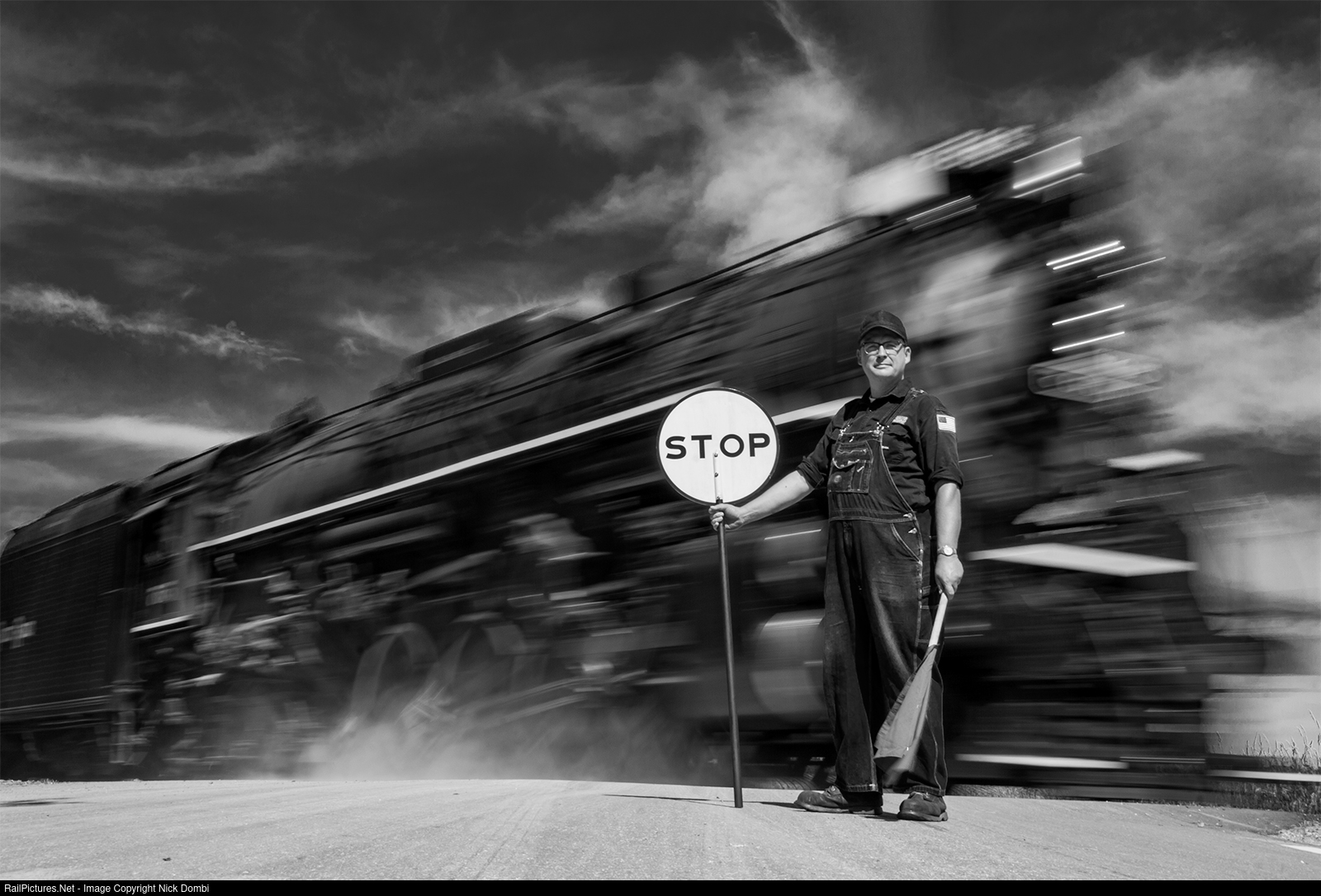 Flagman Brian Smith stands guard over the Michigan-Indiana border as Nickel Plate Road 765 thunders by on a photo runby.