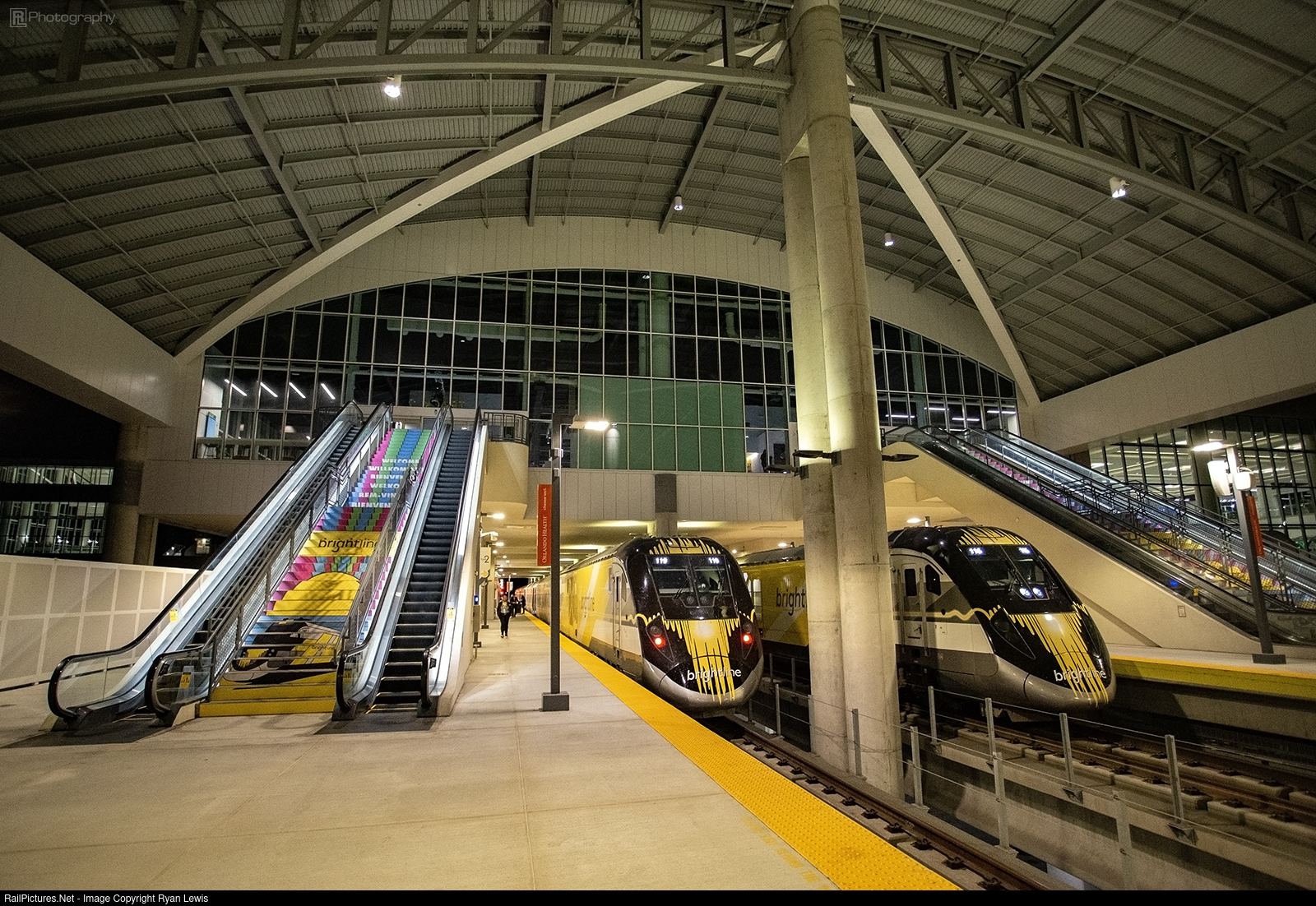 Two Brightline trainsets are seen sitting in Terminal C in Orlando International Airport. These trains will eventually return to Miami, FL with passengers.