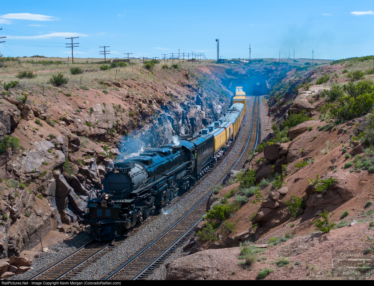 | UP 4014 is headed west on Main 1 after emerging from Hermosa Tunnel on a summer run that will take the train through several western states over the next month or so. The train made a mechanical stop at Harriman, but was right on schedule by the time it reached the tunnels here at Hermosa. |