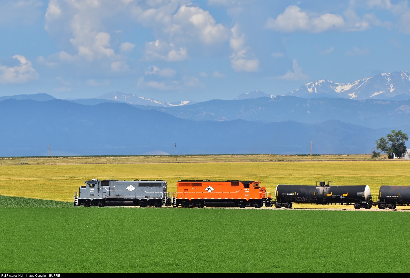 | Green crops and amber grasses greet OmniTRAX #4012 (GP40-2LW) as it moves a cut of freight cars west of Johnstown, Colorado.